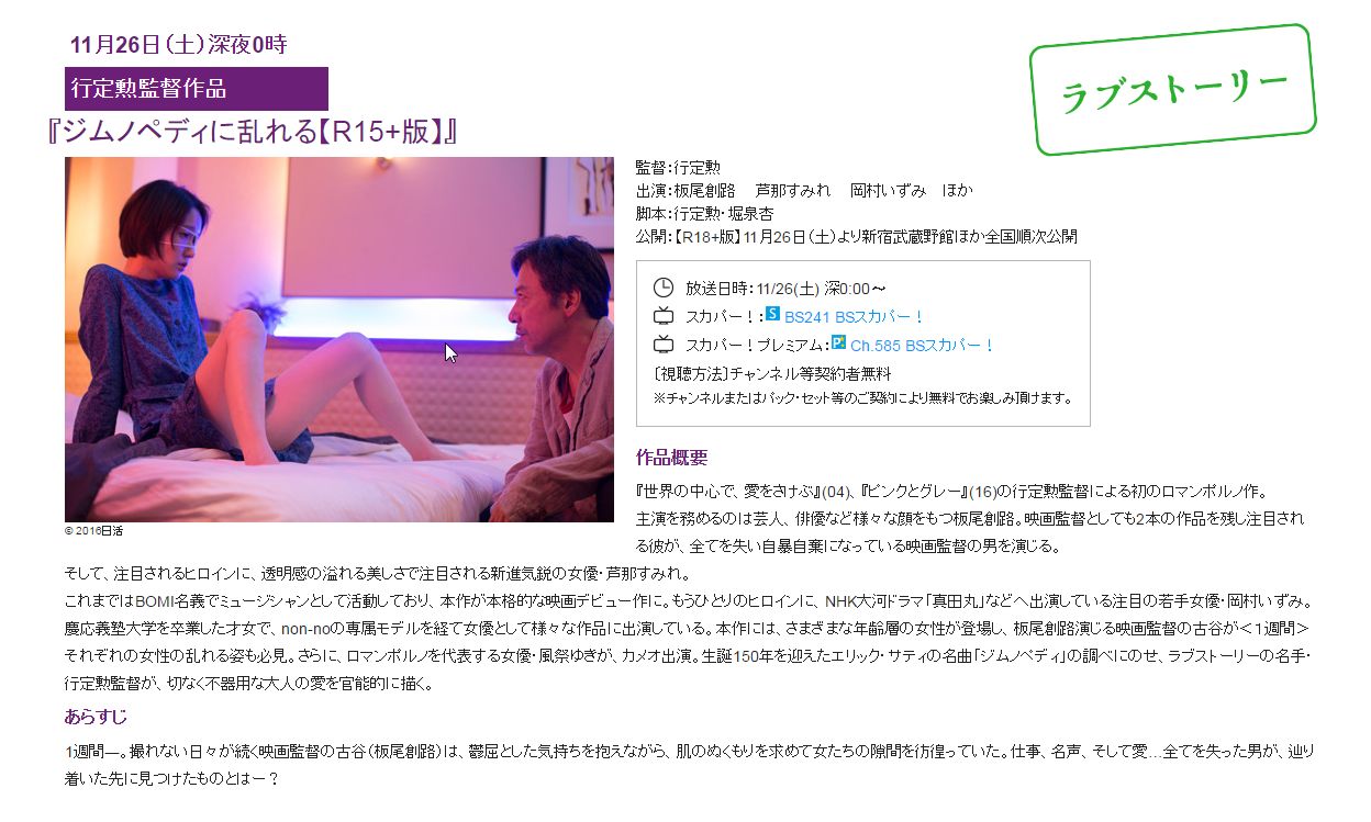 ট ইট র 小原徳子 こはらのりこ Info スカパーでも観れる ロマンポルノリブートプロジェクト5作品 R15版をbsスカパーで劇場公開と同時にオンエア 劇場公開版はr18です 木嶋のりこ出演の ジムノペディに乱れる は 11月26日 土 深夜0 00